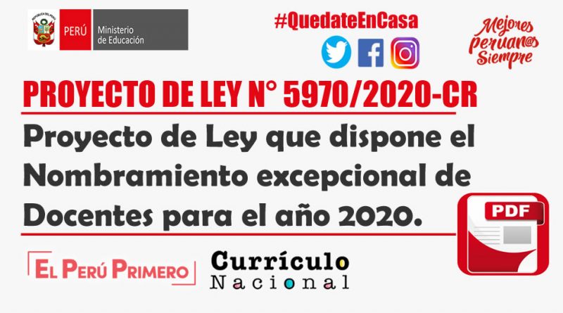 PROYECTO DE LEY N° 5970/2020-CR.- Proyecto de Ley que dispone el Nombramiento excepcional de Docentes para el año 2020.
