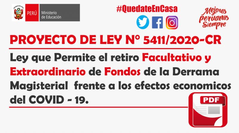 PROYECTO DE LEY N° 5411/2020-CR.- Ley que Permite el retiro Facultativo y Extraordinario de Fondos de la Derrama Magisterial frente a los efectos economicos del COVID – 19.