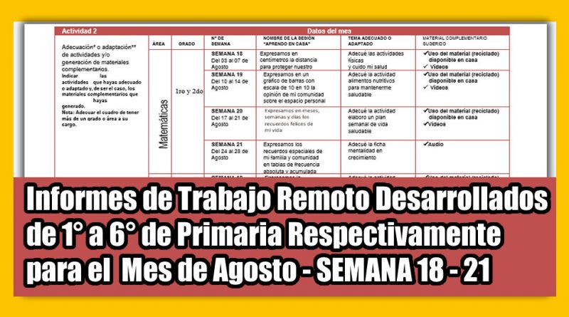 Informes de Trabajo Remoto Desarrollados de 1° a 6° de Primaria Respectivamente para el Mes de Agosto – SEMANA 18 – 21