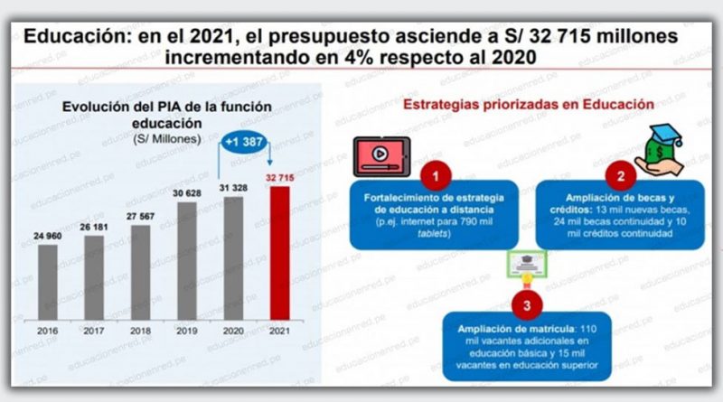 En el 2021, el presupuesto al sector educación asciende a 32,715 millones millones de soles, reflejando un incremento de 4% respecto al 2020.