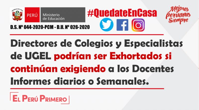 Directores de Colegios y Especialistas de UGEL podrían ser Exhortados si continúan exigiendo a los Docentes Informes diarios o Semanales.