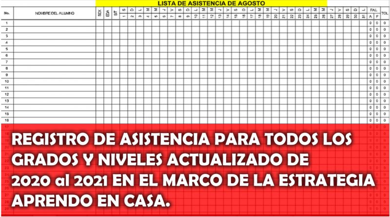 Registro de Asistencia, Para todos los Grados y Niveles Actualizado de 2020 -2021, En el Marco de la Estrategia Aprendo en Casa.