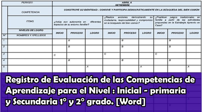 Registro de nivel de Avance de las Competencias de Aprendizaje para el Nivel : Inicial – primaria y Secundaria 1° y 2° grado. [Word]