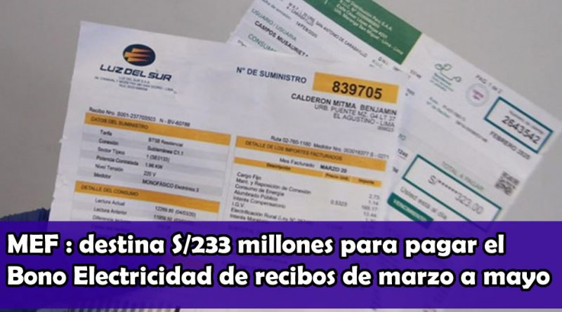 El Ministerio de Economía y Finanzas (MEF), a través del Decreto Supremo N° 315-2020-EF, aprobó una transferencia inicial de S/ 233’544,561 a favor del Ministerio de Energía y Minas para financiar el Bono Electricidad, correspondiente en esta primera etapa a los recibos pendientes de pago de los consumos de marzo, abril y mayo de hogares vulnerables.