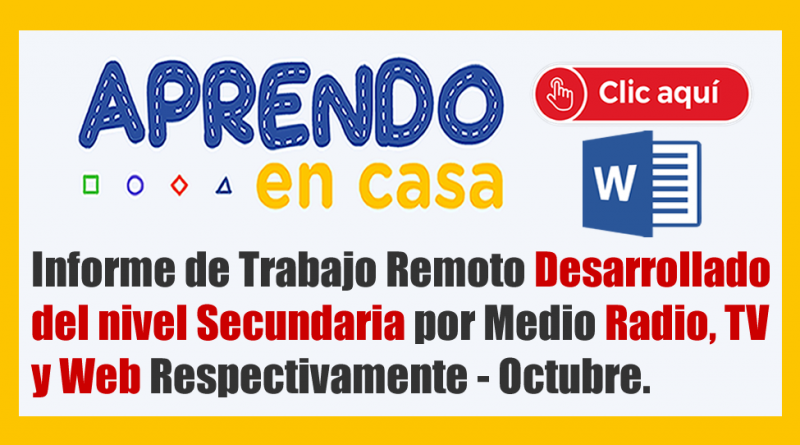 Apreciado maestros y Profesores de todas las Instituciones Educativas hoy les compartimos estos Informes mensuales Consolidados para todos los maestro de nivel Secundaria correspondiente al mes de Octubre, desarrollados según el OFICIO MÚLTIPLE 00049-2020-MINEDU/VMGP-DIGEDD-DITEN, cuyos documentos nos ayudarán a hacer un reporte detallado del Trabajo Remoto en el marco de la estrategia “Aprendo en Casa”.