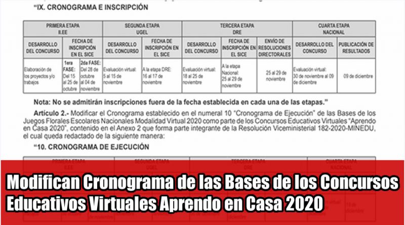 Estimados Docentes en esta oportunidad les compartimos esta información que Modifican Cronogramas de las Bases de los Concursos Educativos Virtuales “Aprendo en Casa 2020”, respecto a la XXX Feria Escolar Nacional de Ciencia y Tecnología “Eureka Virtual 2020”, el Premio Nacional de Narrativa y Ensayo “José María Arguedas” Modalidad Virtual 2020 y los Juegos Florales Escolares Nacionales Modalidad
