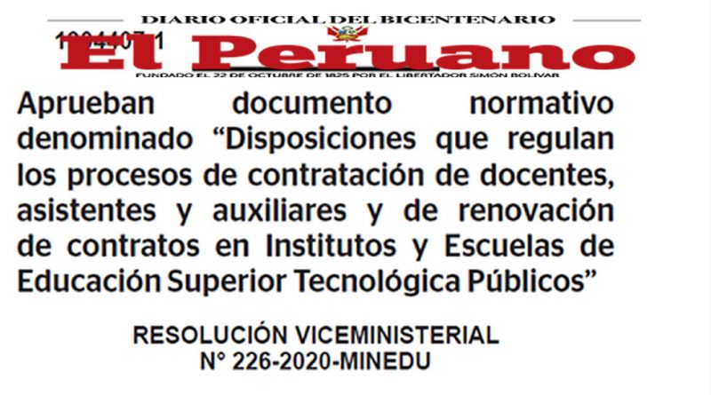 Aprueban Documento Normativo denominado «Disposiciones que regulan los procesos de contratación de docentes, asistentes y auxiliares y de renovación de contratos en Institutos y Escuelas de Educación Superior Tecnológica Públicos» RVM N° 226-2020-MINEDU