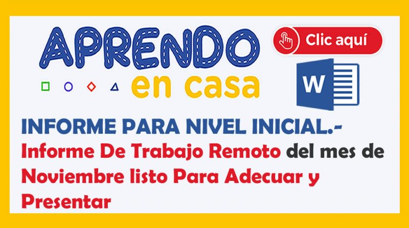 Estimados Docentes de nivel Inicial ,en esta oportunidad les compartimos este fabuloso Informes de Trabajo Remoto desarrollado del nivel Inicial correspondiente al mes de Noviembre. [3, 4 y 5 años].Cuyo informe ayudará al Docente tomar acciones de mejora en el desarrollo de nuestras actividades académicas.