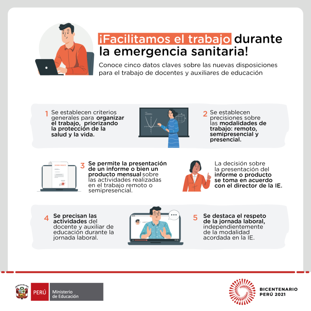 Asimismo, se especifican acá las consideraciones que los docentes y auxiliares de educación deben tener en cuenta para la prestación del servicio. Por ejemplo, la presentación del informe o producto mensual que evidencia su labor pedagógica. Estas orientaciones se dan en el marco del documento normativo “Disposiciones para el trabajo de los profesores y auxiliares de educación que aseguren el desarrollo del servicio educativo de las instituciones y programas educativos públicos, frente al brote del COVID-19”.