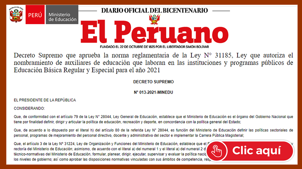 Decreto Supremo que aprueba la norma reglamentaria de la Ley N° 31185, Ley que autoriza el nombramiento de auxiliares de educación que laboran en las instituciones y programas públicos de Educación Básica Regular y Especial para el año 2021 Decreto Supremo N° 013-2021-MINEDU