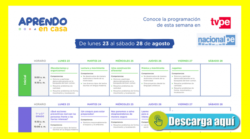 APRENDO EN CASA: Conoce la Programación de esta semana (De lunes 23 al sábado 28 de agosto) en TV Y Radio Nacional [Educación Inicial, Primaria, Secundaria, Básica Especial, PRITE, Somos familia, Educación, Intercultural Bilingüe.[ Descarga Aquí]