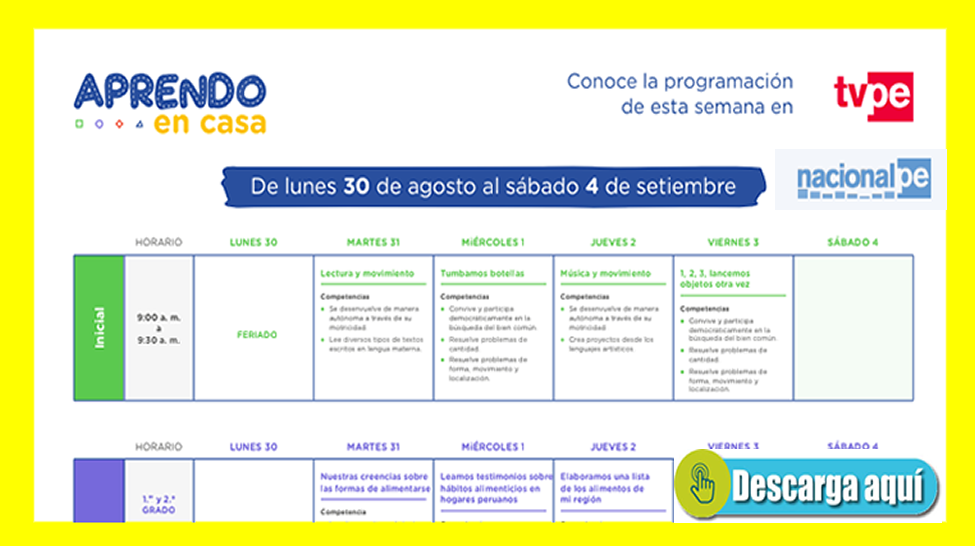 APRENDO EN CASA: Conoce la Programación en TV Perú, RADIO NACIONAL de esta Semana (De lunes 30 de Agosto al Sábado 4 de Setiembre)[Descarga Aquí]