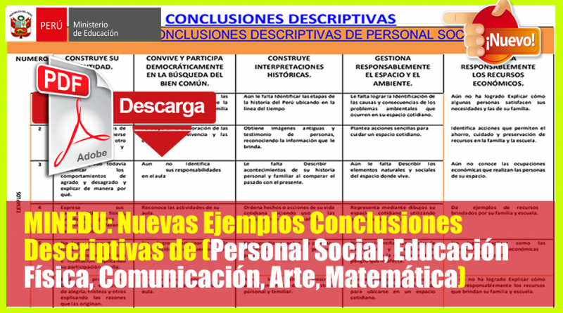 MINEDU: Nuevas Ejemplos Conclusiones Descriptivas de (Personal Social, Educación Física, Comunicación, Arte, Matemática)