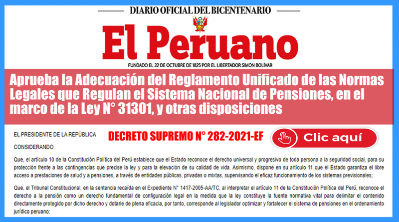Aprueba la Adecuación del Reglamento Unificado de las Normas Legales que Regulan el Sistema Nacional de Pensiones, en el marco de la Ley N° 31301, y otras disposiciones( Decreto Supremo N°282-2021-EF)