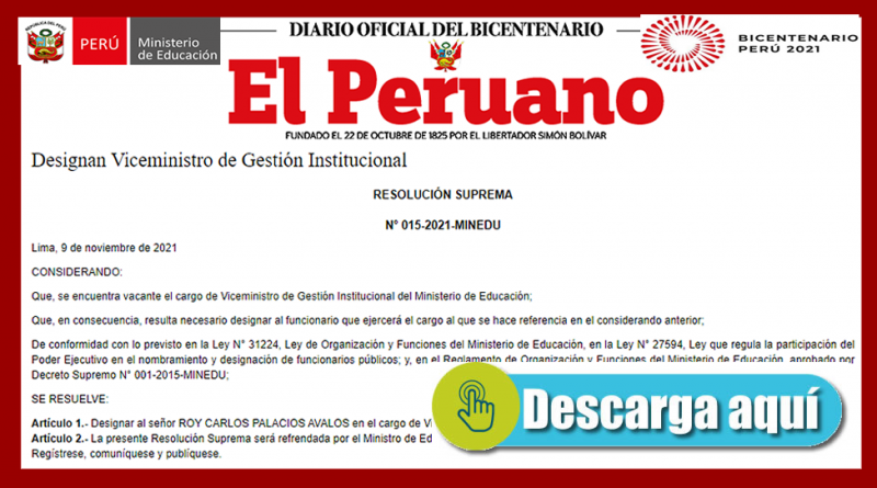Artículo 1.- Designar al señor ROY CARLOS PALACIOS AVALOS en el cargo de Viceministro de Gestión Institucional del Ministerio de Educación.