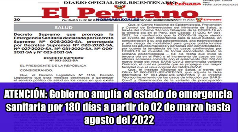 Mediante el Decreto Supremo Nº 003-2022-SA, el Gobierno dispuso la prórroga de la declaratoria de la emergencia sanitaria por la presencia de la COVID-19 en nuestro país, por un plazo de 180 días calendario contados a partir del 2 de marzo próximo.