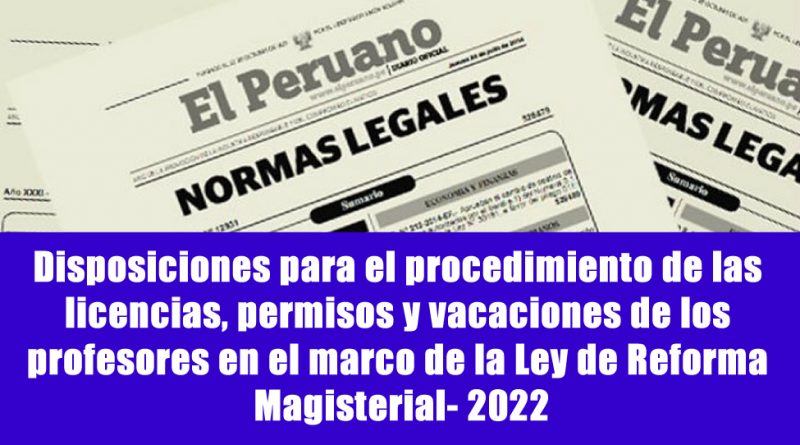 Que, mediante Resolución Viceministerial N° 123-2021-MINEDU, se aprueba el documento normativo denominado “Disposiciones para el procedimiento de las licencias, permisos y vacaciones de los profesores en el marco de la Ley de Reforma Magisterial”, el mismo que tiene por objeto establecer los procedimientos para el goce de las licencias, permisos y vacaciones de los profesores nombrados y contratados de instituciones educativas públicas de Educación Básica y Técnico Productiva y de las Instancias de Gestión Educativa Descentralizada, en el marco de lo establecido en la Ley N° 29944, su Reglamento y demás normas aplicables;