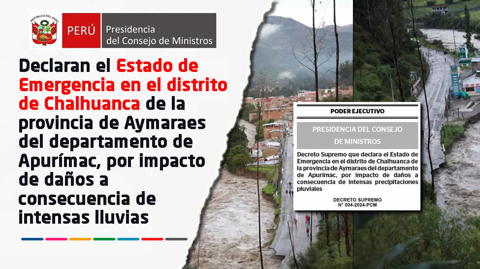 Declaran el Estado de Emergencia en el distrito de Chalhuanca de la provincia de Aymaraes del departamento de Apurímac, por impacto de daños a consecuencia de intensas precipitaciones pluviales | Decreto Supremo N° 004-2024-PCM