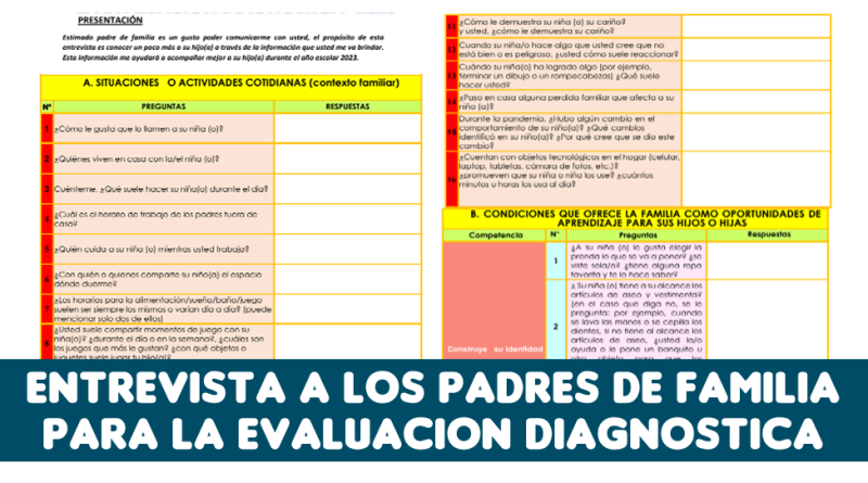 Les compartimos la Entrevista a los padres de familia para la evaluación diagnótica del año 2023 para el Nivel Inicial de 3, 4 y 5 años, organizada por áreas.