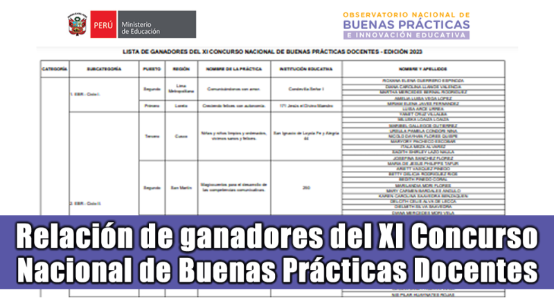 La relación de ganadores se encuentra publicado en el siguiente enlace: https://observatorio.minedu.gob.pe/estrategias/concurso-nacional-de-buenas-practicas-docentes/