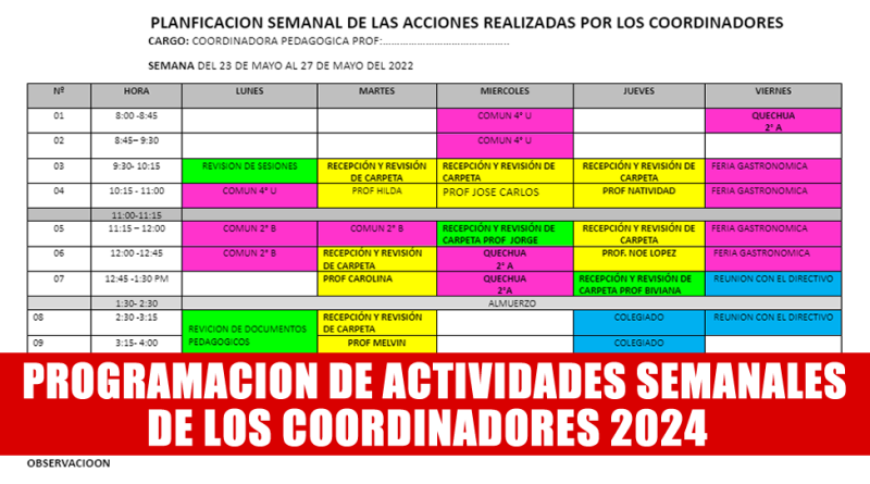PROGRAMACIÓN DE ACTIVIDADES SEMANALES DE LOS COORDINADORES 2024