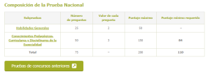 La Prueba Nacional está compuesta por dos subpruebas: Habilidades Generales, y Conocimientos Pedagógicos, Curriculares y Disciplinares de la Especialidad. Para responder esta prueba se ha asignado un tiempo de 3 horas y 45 minutos. Se clasifica a la siguiente etapa si se superan los puntajes mínimos requeridos (ver tabla).