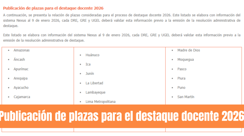 A continuación, se presenta la relación de plazas consideradas para el proceso de destaque docente 2026. Este listado se elabora con información del sistema Nexus al 9 de enero 2026, cada DRE, GRE y UGEL deberá validar esta información previo a la emisión de la resolución administrativa de destaque.