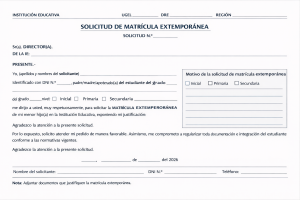 La Solicitud de Matrícula Extemporánea es un documento formal mediante el cual el padre, madre o apoderado solicita a la dirección de una institución educativa la inscripción de un estudiante fuera del plazo oficial de matrícula establecido para el año escolar. Este trámite se realiza cuando, por diferentes motivos justificados —como traslado de ciudad, problemas familiares, situaciones de salud u otras circunstancias— el estudiante no pudo matricularse dentro del periodo regular.