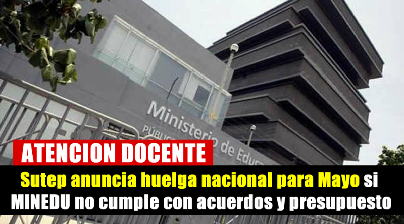 ActualidadCarrera Docente MIGUEL ANGEL 5 marzo, 2024 Sutep anuncia huelga nacional en Mayo si MINEDU no cumple con acuerdos y presupuesto. Read More
