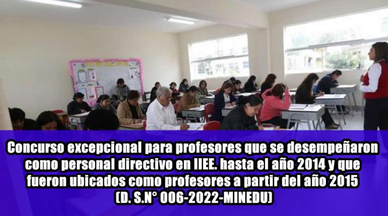 ActualidadAprendo en casaCarrera DocenteDirectoresNormativaPrimariaSecundaria PROFE VIRTUAL 30 abril, 2022 Concurso excepcional para profesores que se desempeñaron como personal directivo en IIEE. hasta el año 2014 y que fueron ubicados como profesores a partir del año 2015 (D. S.N° 006-2022-MINEDU) Read More