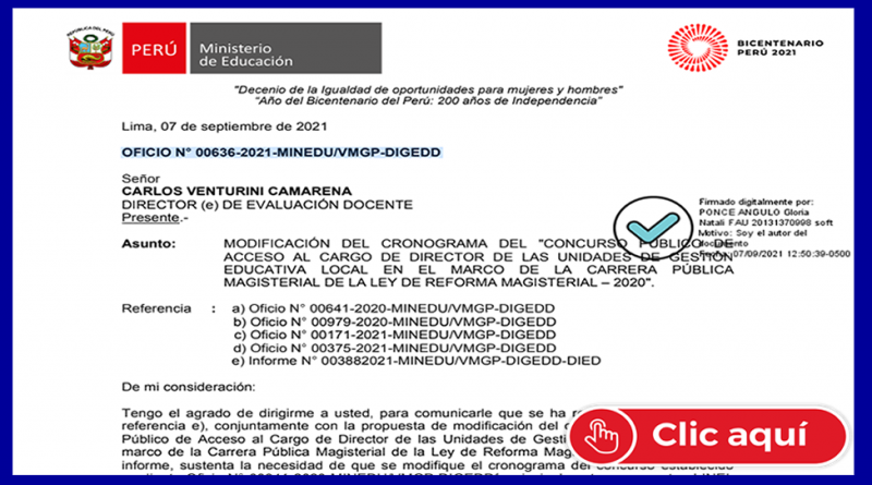 ActualidadCurrículo NacionalNormativaRepositorio MINEDU PROFE VIRTUAL 12 septiembre, 2021 Modificación del Cronograma del «Concurso Público de Acceso al Cargo de Directores de la Unidades de Gestión Educativa Local en el Marco de la Carrera Pública Magisterial de la Ley de Reforma Magisterial – 2020» [OFICIO N° 00636-2021-MINEDU/VMGP-DIGEDD] Read More