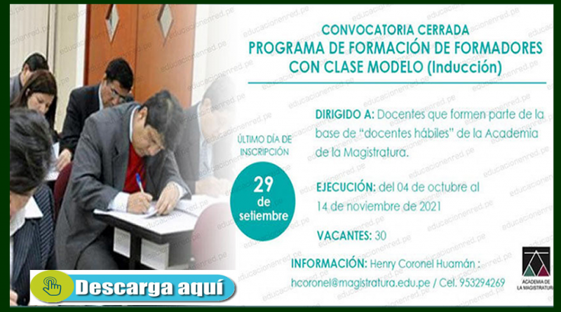 ActualidadCarrera DocenteRecursos PROFE VIRTUAL 27 septiembre, 2021 AMAG – CONVOCATORIA A DOCENTES: Programa de Formación de Formadores con Clase Modelo [Descarga Aquí] Read More